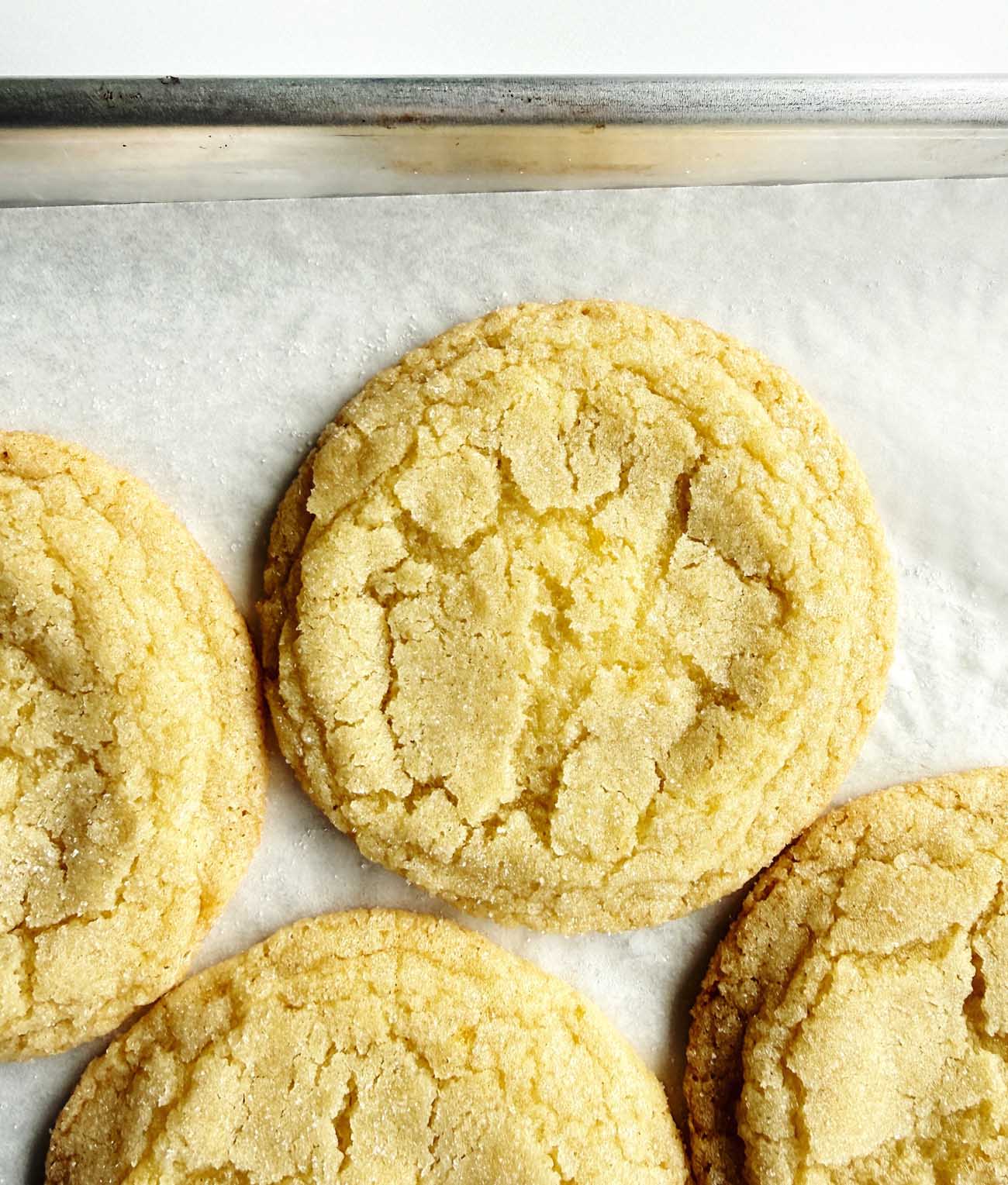 It took awhile to get these cookies just right. The original recipe had a delicate lemon flavor, with crisp edges and a soft, chewy center that almost melted in your mouth. I spent weeks playing around with ratios, and finally settled on 2 tablespoons lemon zest for good flavor, an added egg yolk to help with both softness and richness in the center bite (plus it added a little more yellow color), and both baking powder and soda to help the centers rise while baking, and then gently drop as they cooled, creating a tender, yet chewy center.